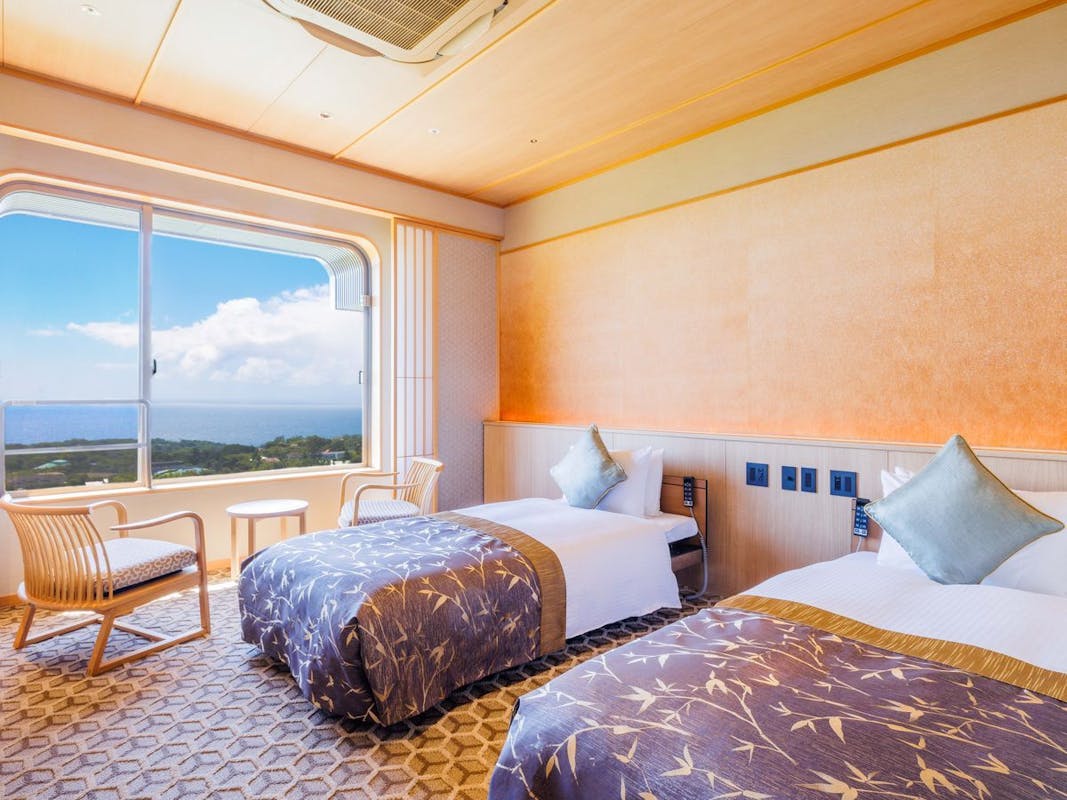 【ベストレート】伊豆大島と伊豆諸島の島々を望む全室オーシャンビューの客室。絶景水盤テラスをはじめ、ゆったりとした時間の流れるウェルネスリゾートホテルです。
